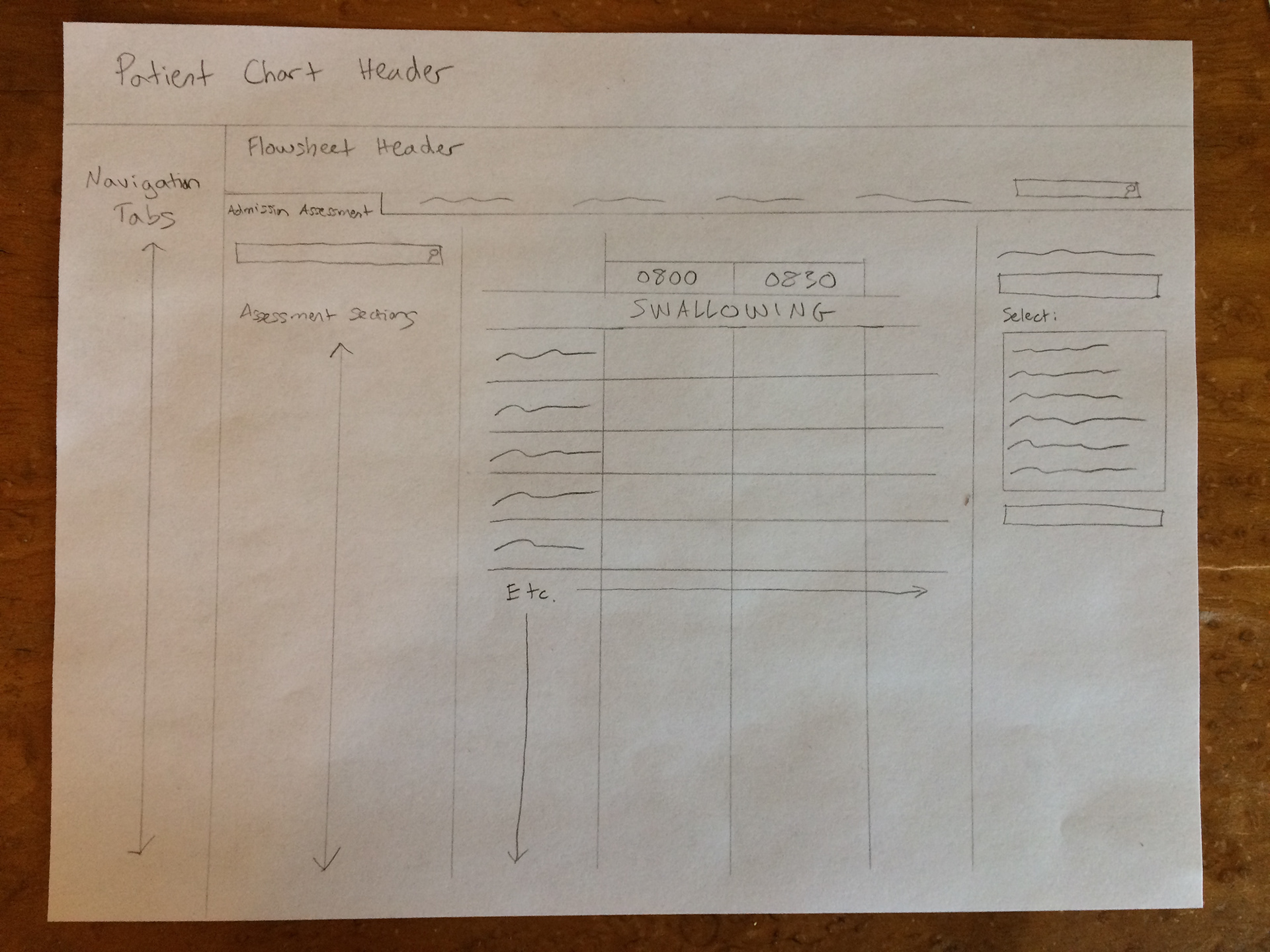 We determined that the best time for the swallow screening to be completed was during the head-to-toe physical assessment because that is when all other screenings were already taking place. After completing a task analysis, I created a user journey to represent the actions, thoughts, emotions, and goals of the user during the admission assessment process. We used it to identify specific pain points and begin to generate ideas.
