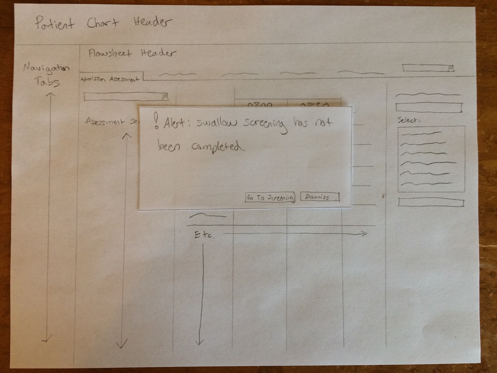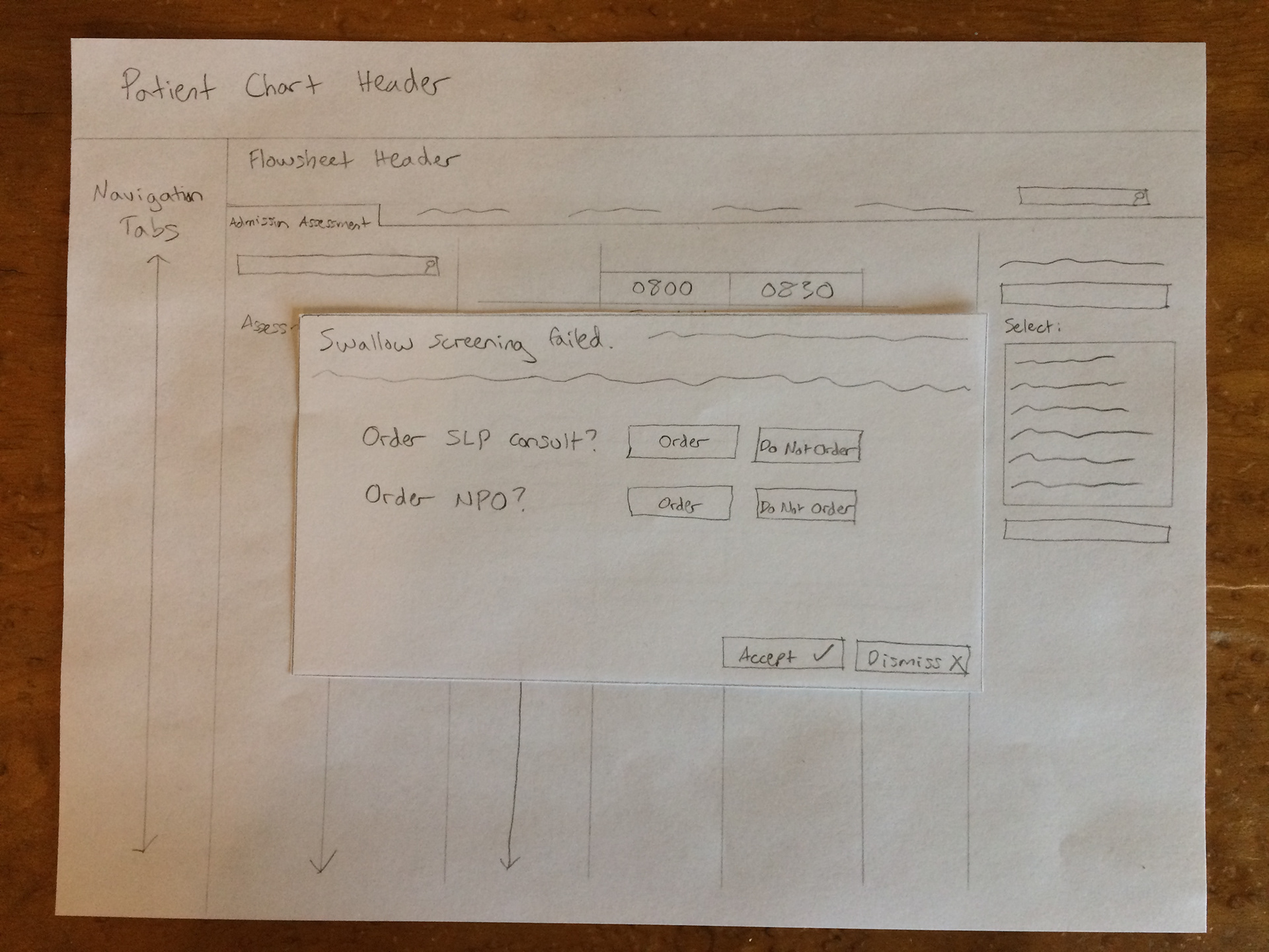 Before creating wireframes, I wanted to make sure our ideas worked for users. I did some quick usability testing with the sketches and discovered that users were confused about what to do when the patient didn't need a swallow screening, so we changed the wording of the reminder prompt. The current Epic and Pyxis design systems guided my UI decisions throughout the design process.