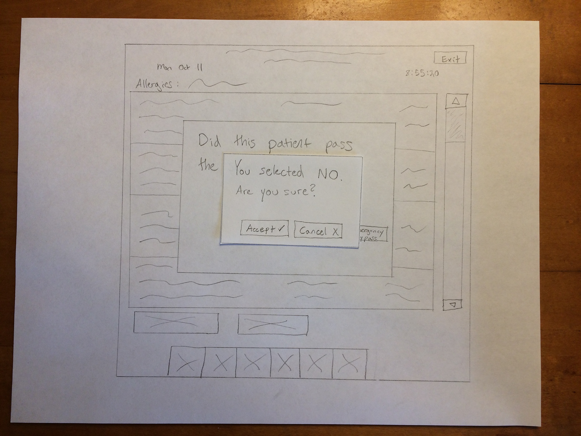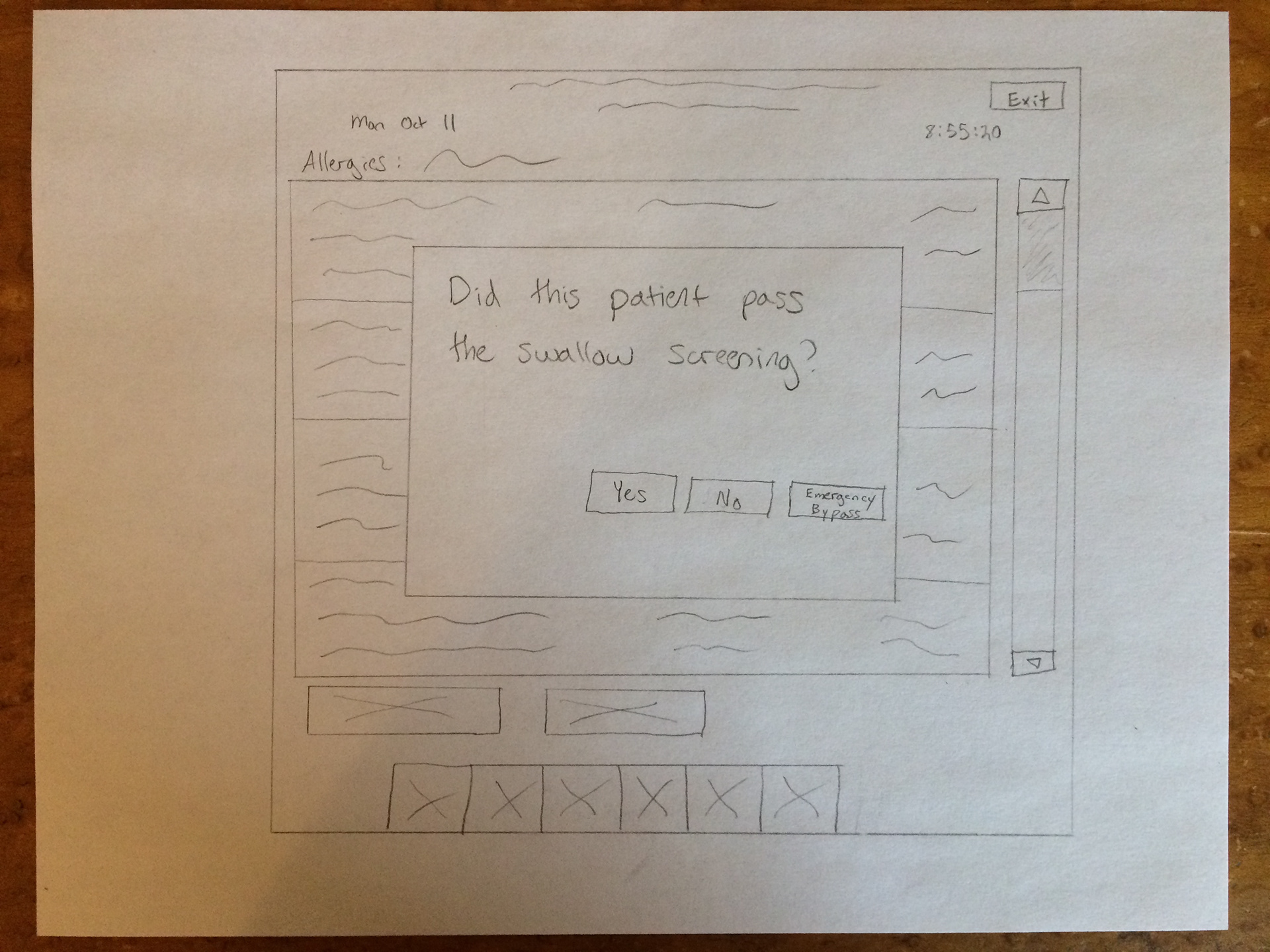 I sketched the screening reminder for Pyxis, checking in with the development team along the way to ensure the technical feasibility of each feature. After selecting a patient, the reminder would ask users to confirm that a swallow screening has been completed before they can select and dispense medications. Saying "yes" or "no" would be a 2-step process for error prevention and recovery, which is especially important in the users' hectic environment.